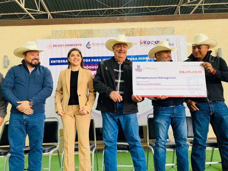 Chihuahua, Chih.- La Secretaría de Desarrollo Rural, en conjunto con la Comisión Nacional del Agua (Conagua) y el Ayuntamiento de Meoqui, encabezó la entrega de 18 millones 470 mil pesos destinados al mejoramiento de la infraestructura hidroagrícola en la entidad, a través de los 31 módulos y unidades de riego.