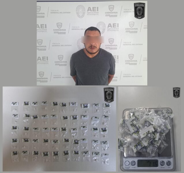 Cuauthémoc, Chih.- Elementos de la Agencia Estatal de Investigación, adscritos a la Fiscalía de Distrito Zona Occidente, detuvieron en flagrancia en las calles Independencia y Tercera de la zona centro a un hombre en posesión de 100 dosis de cocaína en dos diferentes presentaciones.