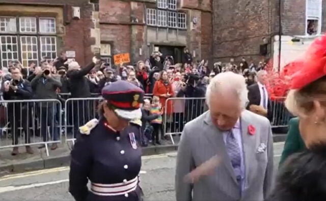 Las imágenes difundidas por las televisiones británicas mostraron como el rey y su esposa Camila estrechaban las manos de las personas congregadas en una calle de York cuando tres huevos lanzados en su dirección cayeron al suelo a pocos centímetros de donde estaban.
