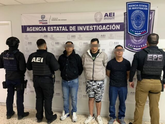 Chihuahua, Chih.- En un operativo conjunto, elementos de la Agencia Estatal de Investigación detuvieron en flagrancia a tres hombres en el Barrio de Londres, quienes dijeron pertenecer a un grupo delictivo denominado “La Empresa”, los cuales portaban fusiles de asalto y pistolas de grueso calibre, además de droga.