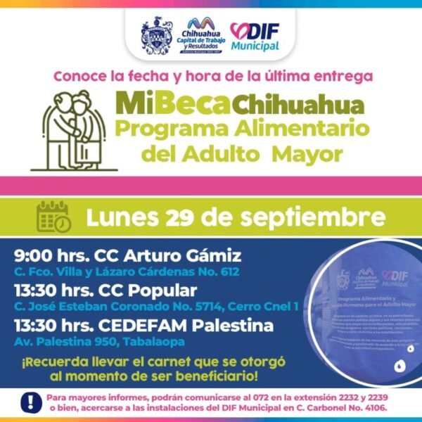 La dependencia subrayó que es fundamental respetar la hora y el lugar indicado para asegurar un proceso ágil y ordenado. Además, recordó que esta jornada corresponde a la última entrega de septiembre, por lo que exhorta a las y los adultos mayores a estar pendientes de las páginas oficiales del Gobierno Municipal y del DIF Municipal para conocer el próximo calendario.