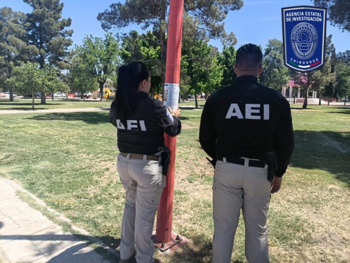 Elementos de la Fiscalía en la zona noroeste realizaron la pega de pesquisas en espacios públicos de Nuevo Casas Grandes, como parte de las acciones de búsqueda de dos personas reportadas como ausentes desde 2021.