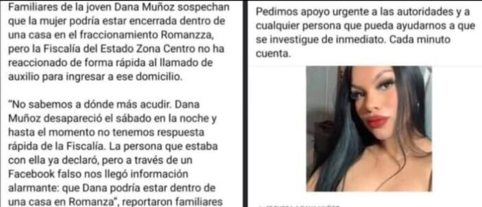 El caso de Danna Angelina Muñoz Rayón, de 21 años, desapareció tras asistir el sábado 17 de agosto de 2025 a una fiesta en la colonia Romanzza, Chihuahua; al día siguiente, los familiares comenzaron a recibir mensajes desde una cuenta anónima en Facebook —supuestamente de una amiga— que afirmaban que Danna estaba sin vida y enterrada en el patio de una vivienda, lo que se trasladó con rapidez a través de redes sociales. Esa misma tarde, familiares, amigos y vecinos se reunieron afuera del domicilio señalado en Romanzza y, con pancartas y gritos como “No nos vamos sin Danna”, exigieron el cateo inmediato. No obstante, pese a la presencia de policías y personal de la Fiscalía, la intervención se retrasó por la falta de orden judicial, lo que generó indignación pública ante lo que se percibió como lentitud institucional. La noche del lunes 18 de agosto se desplegó un operativo en la vivienda de la calle Bolonia; finalmente, en la madrugada del martes 19, tras obtener autorización judicial, las autoridades ingresaron y hallaron a Danna sin vida, enterrada en el patio trasero, y el cuerpo fue trasladado al Servicio Médico Forense para la necropsia correspondiente.