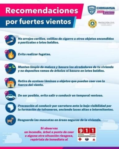 Con base a la información emitida por el Servicio Meteorológico Nacional y la Junta Central de Agua y Saneamiento, la CEPC informa que se espera que estas condiciones meteorológicas empiecen cerca de las 10:00 horas del miércoles y se mantengan durante la noche, madrugada y transcurso del jueves, con rachas de viento superiores a 100 kilómetros por hora (km/h) en la zona serrana, Ojo Laguna Namiquipa y Buenaventura.