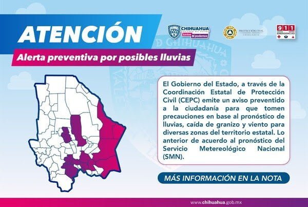 Con base en la información emitida por el Servicio Meteorológico Nacional (SMN), la CEPC informa que para las próximas 72 horas se prevé lluvias de moderadas a puntualmente fuertes con posible acumulación de 50 a 75 milímetros (mm) posibilidad de acumulados de precipitación con chubascos puntualmente fuertes en las regiones Casas Grandes, Cuauhtémoc-Madera y Sierra Tarahumara.