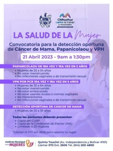 Por lo cual, este próximo viernes 21 de abril se realizarán pruebas gratuitas para la detección oportuna de cáncer de mama, papanicolaou y virus del papiloma humano (VPH), en conjunto con la Secretaría de Salud del Gobierno del Estado, en las instalaciones del Instituto Municipal de las Mujeres, ubicado en la Quinta Touché, en avenida Independencia y Paseo Bolivar, colonia Centro.