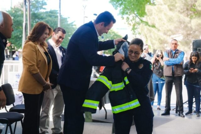 En su intervención, el jefe de la Policía Municipal Julio César Salas, remarcó que los equipos es lo más avanzado para protección para bomberos, superando las normas NFPA 1971 por su tecnología militar y deportiva, que los hacen más ligeros que los equipos convencionales.