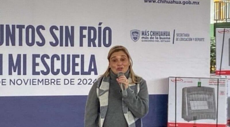 Chihuahua, Chih.- La gobernadora del Estado, María Eugenia Campos, realizó la entrega cinco calentones en las instalaciones de la Escuela Secundaría Federal No, 1 “Guillermo Prado Prado”, como parte de la campaña “Juntos sin Frío en mi Escuela”, programa homólogo de la campaña   encabezada por encabezada por el Desarrollo Integral de la Familia (DIF Estatal), los cuales se orientan a proporcionar insumos a poblaciones que presentan algún grado de vulnerabilidad de cara a la temporada invernal 2024-25, y que conste en la principalmente en acopio de prendas de abrigo, despensas y calentones a familiar de las periferias de Ciudad Juárez y la zona serrana, así como proporcionar medios de aclimatización de escuelas de educación básica.