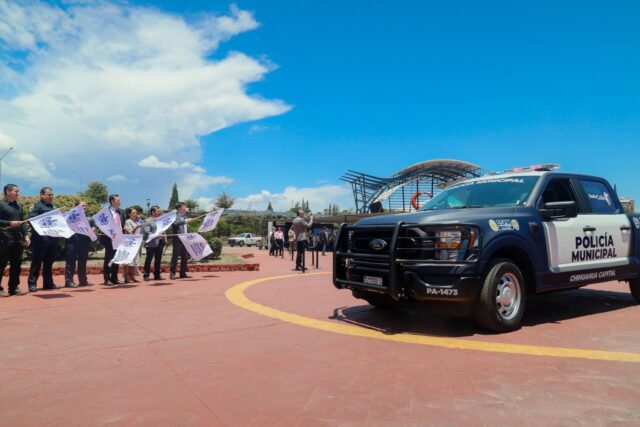 Chihuahua, Chih.- Para servir y proteger a las familias de la ciudad de Chihuahua, el alcalde Marco Bonilla Mendoza, hizo entrega a elementos de la Policía Municipal, 23 nuevas patrullas equipadas con la última tecnología de la Plataforma Escudo Chihuahua Capital (PECUU), para reforzar la vigilancia y seguridad en el municipio.