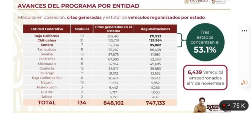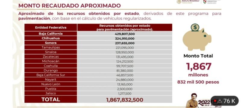 El programa de regularización ha obtenido en total 1867 millones 832 mil 500 pesos, y los estados de Baja California, Chihuahua y Sonora concentran el mayor número de vehículos regularizados y por ende el mayor ingreso de recursos para pavimentación.