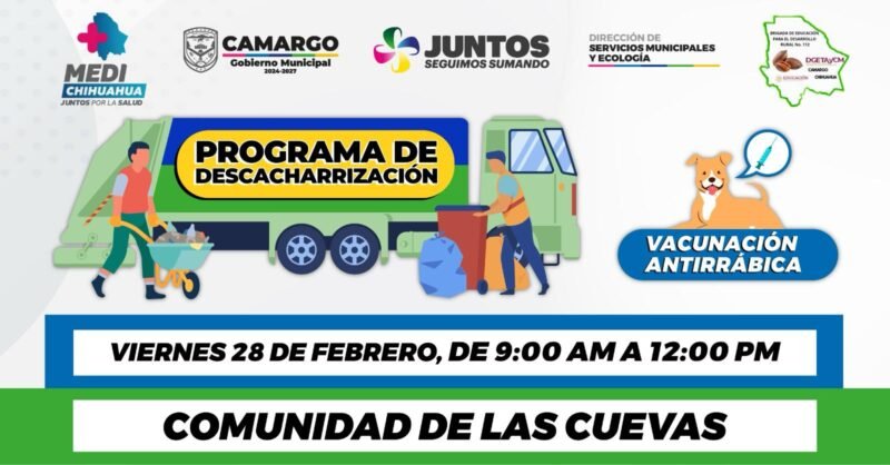 El Gobierno Municipal de Camargo informa que este viernes 28 de febrero se llevará a cabo la jornada del Programa de Descacharrización en la comunidad vecina de Las Cuevas, a partir de las 9:00 a.m. en la plaza principal. Se invita a todos los residentes de Las Cuevas a participar activamente, acercando aquellos objetos que ya no utilicen y que puedan representar un foco de infección o acumulación de plagas.