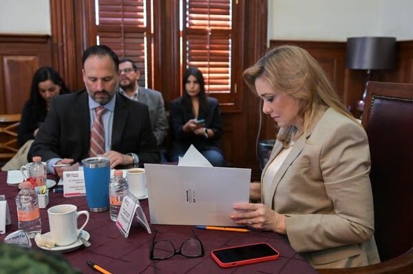 Chihuahua, Chih.- En sesión de la Mesa Estatal de Coordinación para la Construcción de la Paz, presidida por la gobernadora Maru Campos, autoridades de los distintos órdenes evaluaron las estrategias implementadas en conjunto, para fortalecer la seguridad de las personas en situación de migración.