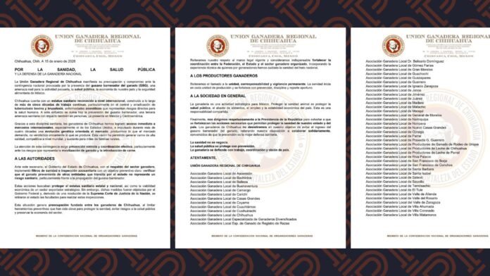 La Unión Ganadera Regional de Chihuahua reiteró su respeto al marco legal vigente y llamó a fortalecer la coordinación entre la Federación, el Estado y el sector ganadero organizado, así como a la unidad y corresponsabilidad de los productores en la vigilancia sanitaria.