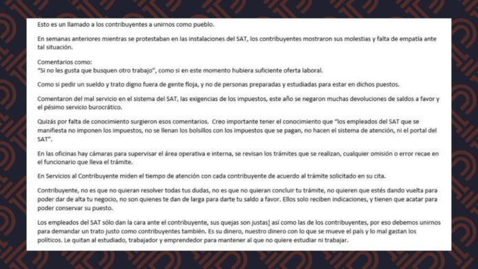 Un presunto comunicado de empleados del Servicio de Administración Tributaria (SAT) en paro laboral llamó a los contribuyentes a solidarizarse con su movimiento y a exigir un trato justo tanto para los trabajadores del organismo como para los ciudadanos.