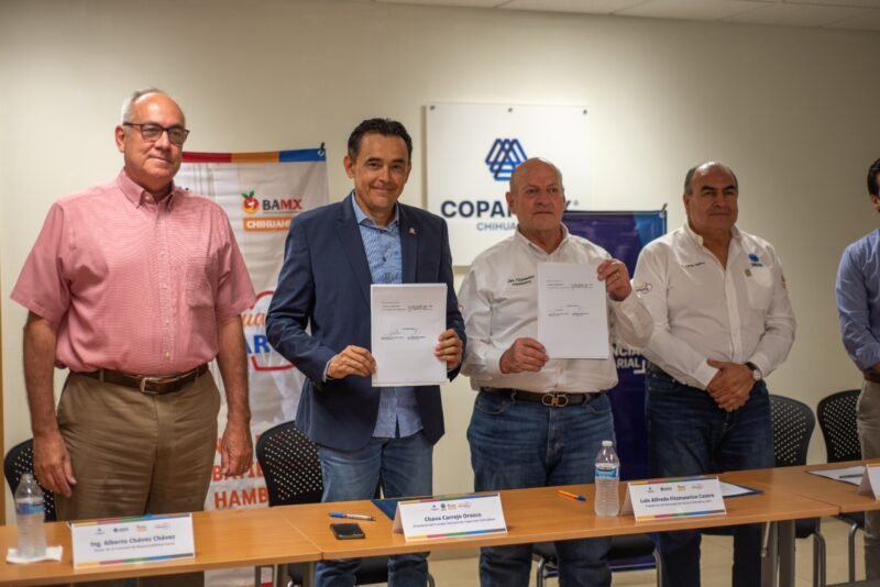 Chihuahua, Chih.- Con el objetivo de apoyar a las familias de la ciudad de Chihuahua y de la zona serrana que se encuentran en situación de inseguridad alimentaria, directivos de COPARMEX Chihuahua y Cáritas, en alianza con el Banco de Alimentos, firmaron un convenio de colaboración para reunir fondos y alimentos en favor de los habitantes de esas regiones del Estado, esto en el marco de la campaña permanente «Chihuahua Comparte«.