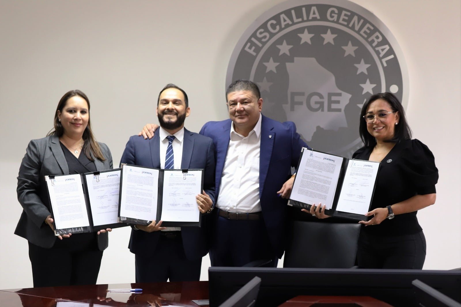 Por el ICATECH firmaron el convenio José Arturo Morales Reyes, como Director General, quien estuvo acompañado por Eugenia Haydee y Jacinto Riosvelasco, mientras que, por la Fiscalía, el Fiscal César Jáuregui Moreno y la Directora General de Administración, Lic. Patricia Franco.