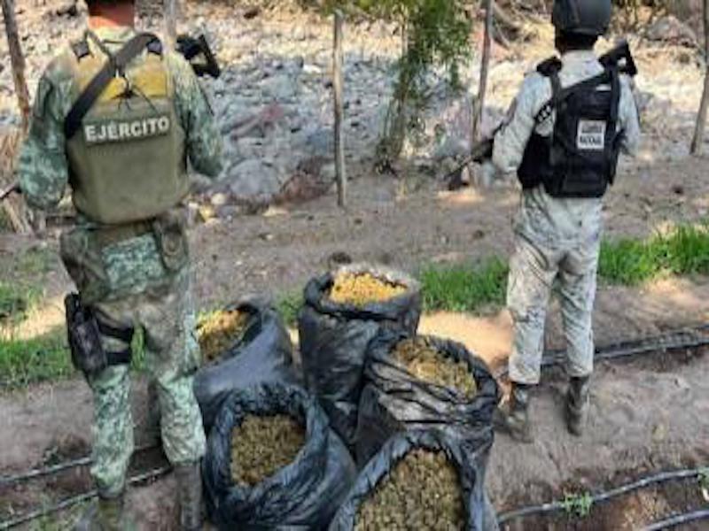 Tras establecer un cerco de seguridad, los integrantes del Ejército Mexicano y de la Guardia Nacional procedieron a inspeccionar la zona, detectando un secadero con plantas con las características propias de la mariguana.