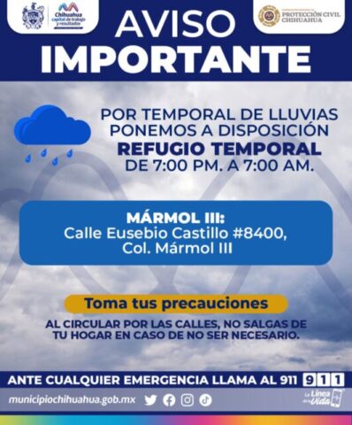 El refugio temporal Mármol III está ubicado en la calle Eusebio Castillo #8400 de la colonia Mármol III atenderá a la zona sur de la ciudad. En este espacio se brindará revisión médica como filtro sanitario al ingresar; además, los elementos de Seguridad Pública Municipal apoyarán con la revisión a las personas que ellos trasladen.