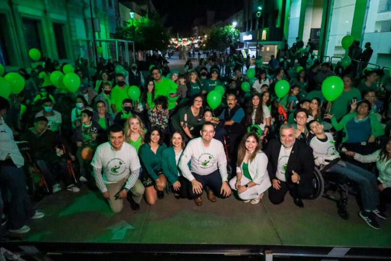 Personas con parálisis cerebral y sus familias, se dieron cita en la Plaza de Armas, para conmemorar el Día Mundial de la Parálisis Cerebral con la iluminación del primer cuadro de la ciudad en color verde, para visibilizar este trastorno y hacer conciencia en los chihuahuenses.