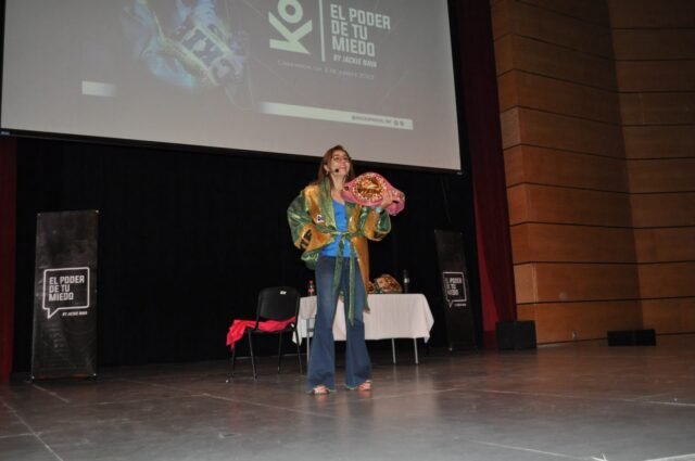 Deportistas, entrenadores y padres de familia recibieron esta tarde la conferencia “KO, el poder de tu miedo” a cargo de la ex campeona mundial de boxeo JackieNava, ponencia que tuvo como escenario el Teatro de Cámara “Fernando Saavedra” en la capital del estado.
