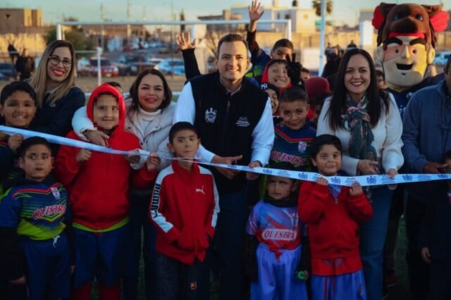 Chihuahua, Chih., a 08 de febrero de 2023.- El día de ayer por la tarde, el presidente municipal de Chihuahua Capital, Marco Bonilla, realizó la entrega formal de la instalación de pasto sintético, reparación de malla ciclónica y alumbrado, en la cancha de fútbol Questra en la colonia Villas del Real, al norte de la ciudad, una obra más que forma parte del Presupuesto Participativo, la cual beneficiará a más de 2 mil habitantes.