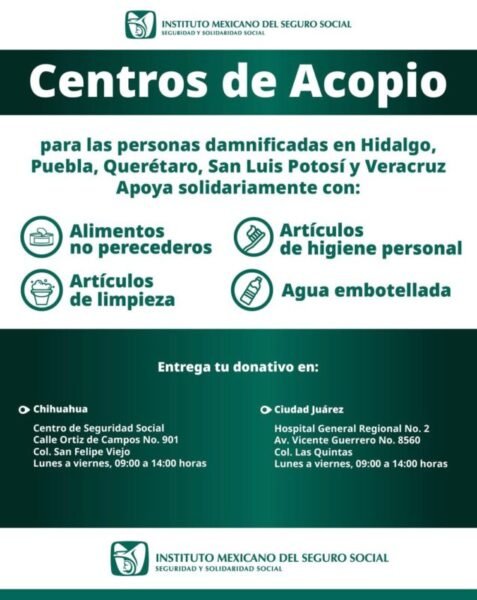 El Instituto Mexicano del Seguro Social (IMSS) en Chihuahua instaló Centros de Acopio en la capital del estado y en Ciudad Juárez, con el propósito de apoyar solidariamente a las personas damnificadas en los estados de Hidalgo, Puebla, Querétaro, San Luis Potosí y Veracruz.