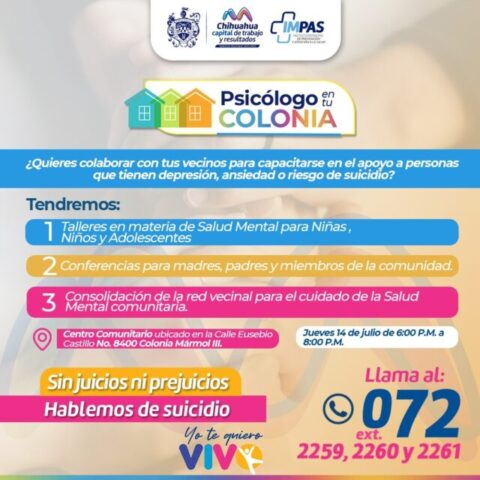 El Gobierno Municipal de Chihuahua, a través del Instituto Municipal de Prevención y Atención a la Salud (IMPAS), llevará a cabo el programa “Psicólogo en tu Colonia” como parte de la campaña “Yo te Quiero Vivo”, este jueves 14 de julio en un horario 18:00 a 20:00 horas, en las instalaciones del centro comunitario Mármol III.