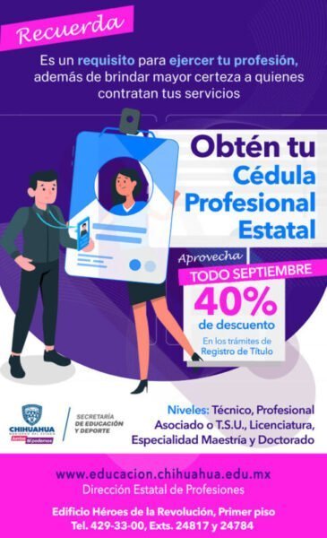Chihuahua, Chih.- La Secretaría de Educación invita a los profesionistas y recién egresados de las instituciones de educación técnica profesional y de nivel superior a aprovechar los últimos días de descuento del 40 por ciento en el trámite de la Cédula Profesional Estatal.