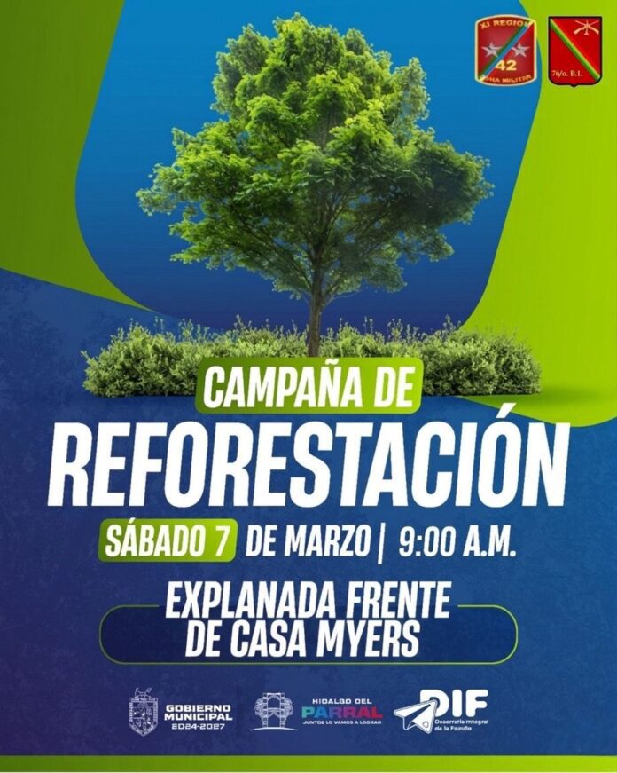 El Gobierno de Parral invitó a la ciudadanía a participar en una campaña de reforestación que se realizará el sábado 7 de marzo a las 9:00 de la mañana, con punto de encuentro frente a Casa Myers.