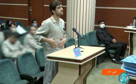 En uno de esos videos, se ve a Karami visiblemente angustiado mientras «confiesa« haber golpeado al miembro del Basij en la cabeza con una piedra. Su abogado de oficio no cuestiona ni discute esto y, en cambio, pide perdón al juez. Karami luego dice que fue «engañado» y se sienta.