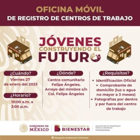 A fin de acercar los programas del Bienestar a las personas que más lo necesitan, la delegación regional de Ciudad Juárez, llevará este viernes la Oficina Móvil de Registro de Centros de Trabajo al Centro Comunitario Felipe Ángeles para que se realice la inscripción al programa Jóvenes Construyendo el Futuro.