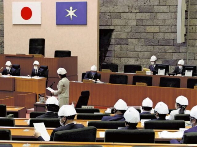 Ciudad de México.- Los miembros de la Asamblea de la Prefectura de Chiba —el parlamento regional— realizaron sus funciones legislativas usando de cascos de emergencia después de que pequeña parte del techo del pleno se cayera el día anterior.