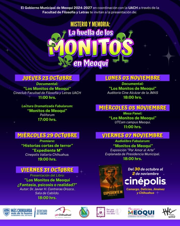 El calendario de actividades inicia el 29 de octubre con la premier del cortometraje “Expediente M” en la ciudad de Chihuahua, seguido de la presentación del libro “Los Monitos de Meoqui: ¿Fantasía, psicosis o realidad?”, del doctor Javier Contreras Orozco, y la proyección del documental realizado por estudiantes de Periodismo de la UACH.