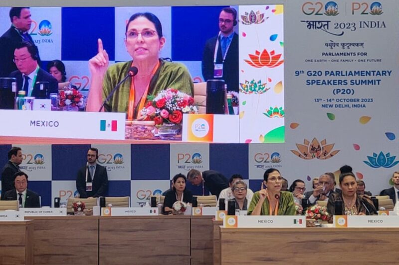 Al participar en la novena Cumbre de Presidencias Parlamentarias del G20 (P20), en Nueva Delhi, India, con el tema: Del desarrollo de la mujer al desarrollo de las mujeres liderado por mujeres, la diputada presidenta dijo que “garantizar la paridad como principio constitucional, asegura que ellas ocupen los cargos de más alto nivel y participar en la toma de decisiones más relevantes”.