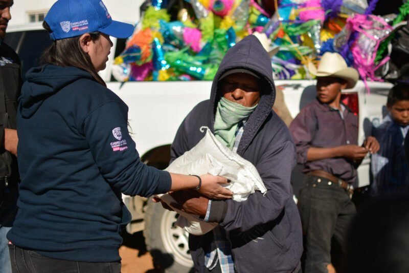 Durante la gira de trabajo por el poblado, ubicado en uno de los puntos más remotos de la sierra tarahumara, se distribuyeron paquetes de arroz y frijol de cinco kilogramos a las personas beneficiarias