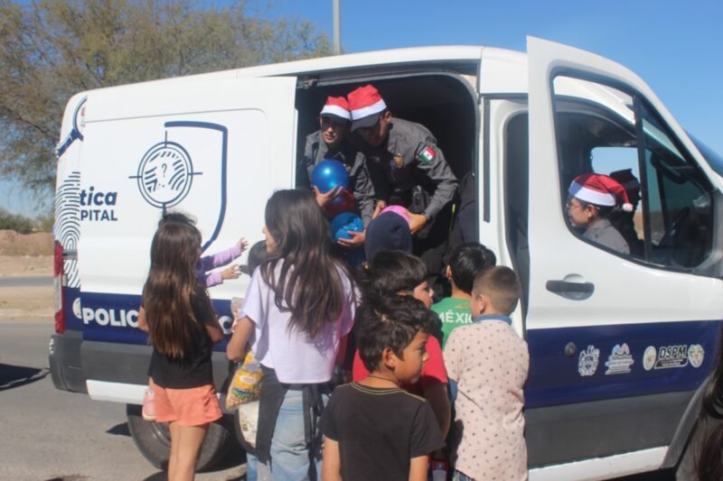 Policías de los grupos especiales canino K9 y Inteligencia de la Dirección de Seguridad Pública Municipal, llevaron felicidad a docenas de niñas, niños y adultos que, en víspera de Navidad.