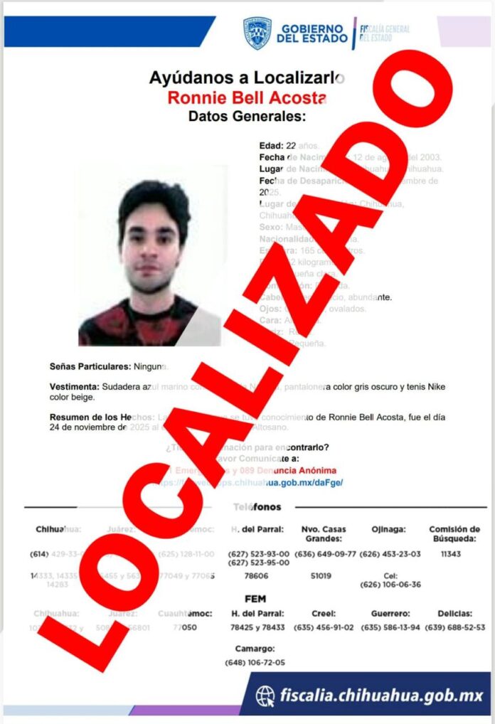 La Fiscalía de Distrito Zona Centro informó que Roninie B. A., de 22 años, fue localizado en buen estado de salud luego de que se interpuso un reporte de ausencia en Chihuahua. El joven había sido visto por última vez al salir del Club Altozano, lo que motivó la solicitud de apoyo por parte de sus familiares.