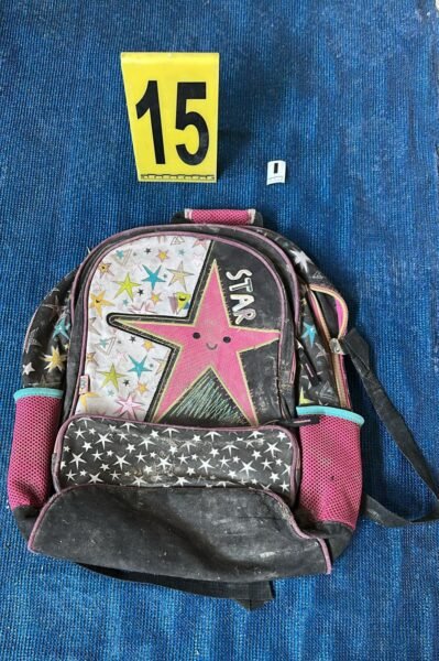 Aparece también una mochila de colores rosa, blanco, negro y azul, con varios logotipos de estrellas pequeñas y una estrella rosa, grande, en la parte central. Mochila que guarda similitud con la que llevaba consigo la niña Esmeralda Castillo Rincón, de 14 años, el 19 de mayo de 2009, cuando desapareció en Ciudad Juárez.