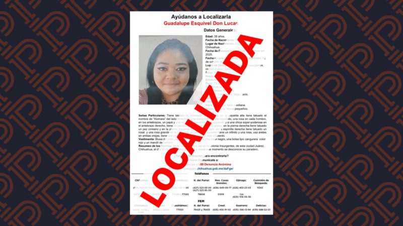 La Fiscalía Especializada en Atención a Mujeres Víctimas del Delito por Razones de Género y a la Familia de la Zona Norte, localizó sana y salva a la mujer de iniciales G. E. D., de 39 de edad, que contaba con reporte de desaparición y/o ausencia, en Ciudad Juárez.
