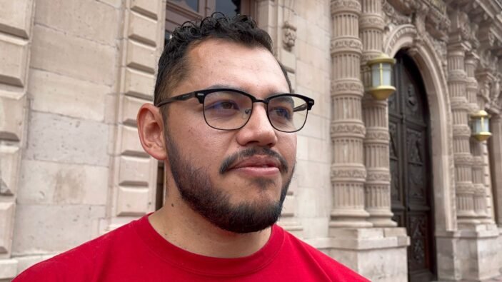 «Rechazamos esa intención de hacernos ver como maestros y maestras violentos», declaró el docente Andrés Varela en representación de los integrantes del magisterio que se manifestaron esta mañana en Plaza Hidalgo por el Día del Maestro, luego de que la administración estatal acordara el semiblindaje de Palacio de Gobierno con paneles de madera comprimida.