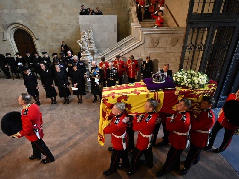 Pasadas las 15:00 (14:00 GMT), el féretro llegó al salón de Westminster Hall, en el recinto del Parlamento británico, donde fue colocado sobre un catafalco con el color púrpura de la realeza y donde los ciudadanos podrán darle su último adiós.