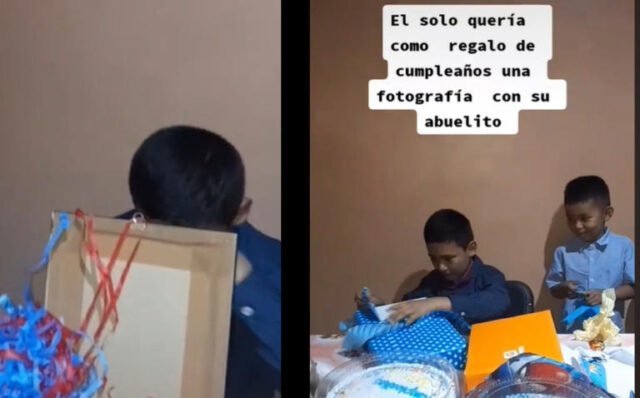Aunque la mayoría de los niños pide juguetes, en esta ocasión los internautas quedaron sorprendidos, pues el pequeño cumpleañero pidió una imagen junto a su abuelo. Su deseo se cumplió. Al quitarle el envoltorio al obsequio, el niño rompió en llanto: en sus manos tenía un retrato con su abuelo.