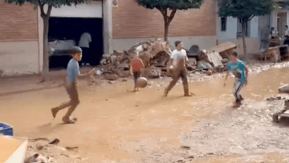 En la comunidad de Aldaia fueron captados en video cuatro menores que decidieron sacar un balón y entre los escombros y el lodo se pusieron a jugar futbol.