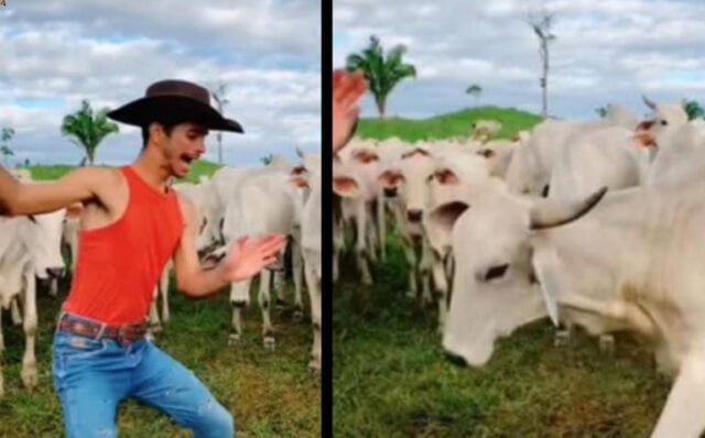 De acuerdo con lo mostrado en el clip, el joven aparece rodeado de varias vacas bailando un trend del tema ‘Pipoco’, canción popular brasileña de la artista Ana Castela.