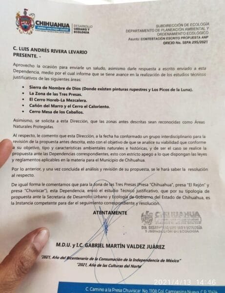 En el 2021, evitaron un oficio a Luis Andrés Rivera Levario de la Subdirección de Ecología en el Departamento de Planeación Ambiental y Ordenamiento Ecológico, para pedir que se declaren protegidas las zonas de la Sierra de Nombre de Dios; La Zona de las Tres Presas; El Cerro Horeb-La Mezcalera; Cañón del Marro y el Cerro del Caloriento; Cerró Mesa de los Caballos.