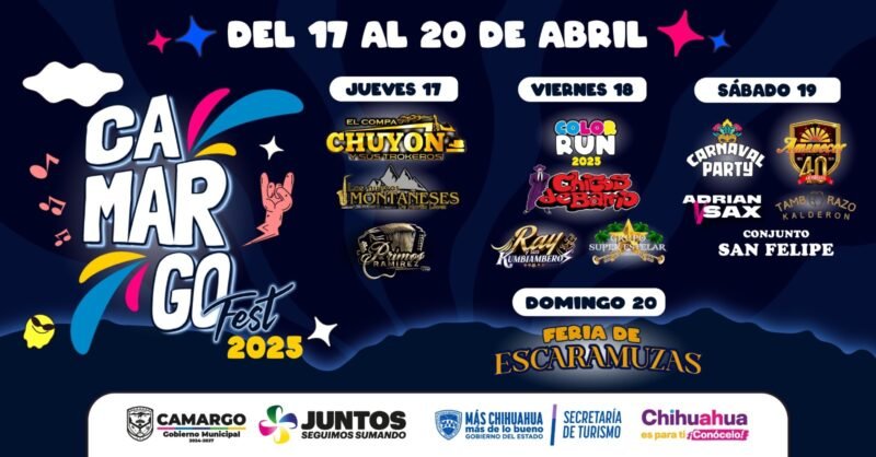 El Gobierno Municipal de Camargo, en coordinación con la Secretaría de Turismo del Estado de Chihuahua, invita a toda la población a disfrutar del Camargo Fest 2025, que se celebrará del 17 al 20 de abril, con una cartelera llena de espectáculos musicales, actividades culturales y diversión para toda la familia.