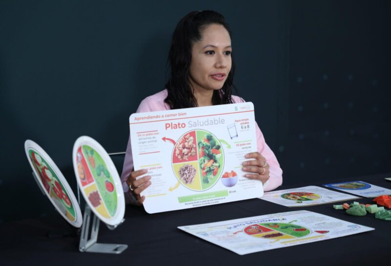 Detalló que el Plato saludable indica la cantidad de alimentos a consumir distribuidos en un plato de 23 centímetros. La mitad debe contener verduras crudas de diversos colores para que haya un buen aporte de fibra, la cuarta parte debe tener alimentos de origen animal como pescado, queso panela, pollo o res y el resto, cereales como arroz, sopa de pasta, tortilla o leguminosas como frijoles, habas o lentejas.