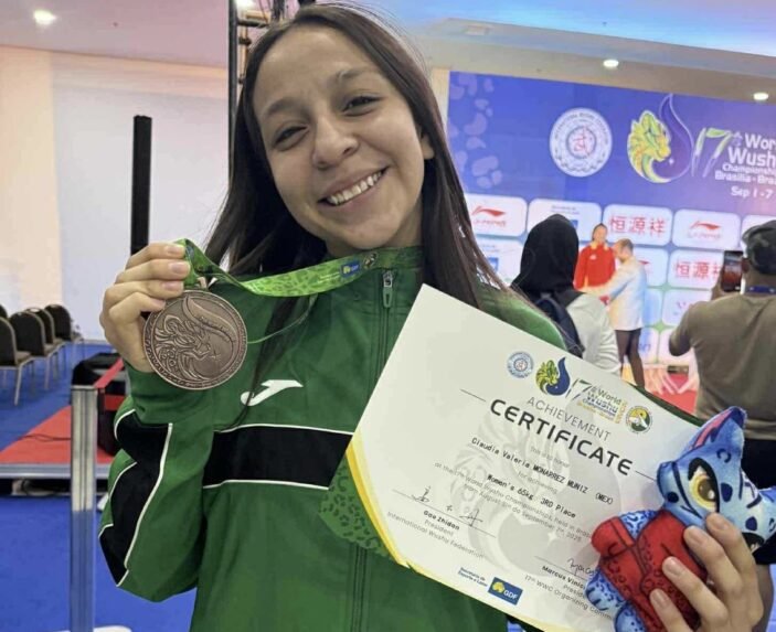 La chihuahuense Valeria Monarrez Muñiz de 20 años de edad le otorgó a México la medalla de bronce en la edición 17 de este Campeonato del Mundo de Wu Shu con sede en Brasil.