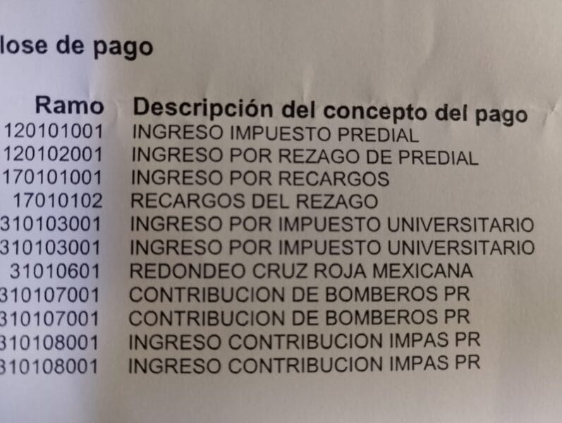 Uno por impuesto predial, otro por rezago, por recargos, recargos del rezago, el impuesto universitario, otro igual, redondeo para la Cruz Roja, dos por contribución de bomberos y otros dos de contribución al IMPAS.
