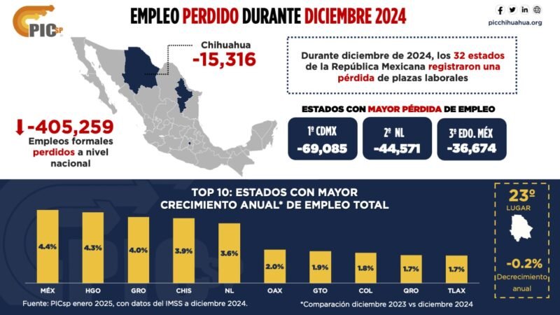 En diciembre de 2024, el estado de Chihuahua perdió 15,316 empleos formales, cifra menor en comparación con los 25,388 empleos perdidos en el mismo mes de 2023, de acuerdo con la Plataforma Inteligente de Competitividad del Sector Privado (PICsp).